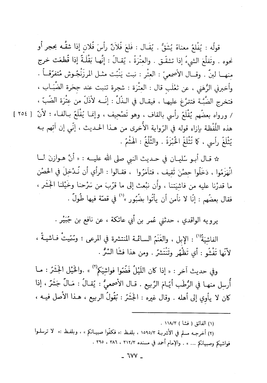 قولُه: يُفْلعُ معناهُ يُشَقُّ. يُقَال: فَلعَ فُلانٌ رأسَ فُلانٍ إذَا شقَّه بحجر أو نحوه. وتَفلَّعَ الشيءُ إذَا تشقّق. والعِتْرَة يُقالُ إنها بقلة إذا قطعت خرج منها لبنٌ. وقال الأصمعيّ العِتْر نبت يَنْبُت مثل المرزَنْجُوش مُتفرّقًا. وأخبرني الرُّهَني عَنْ ثعْلَبٍ قَالَ العِتْرَة شجرة تنبت عند جِحَرة الضِّبَاب فتخرج الضَّبَّة فتتمرَّغ عليها فيقال في الذُلِّ إنّه لأذَلّ من عِتْرَة الضّبّ ورواه بعضُهم يُقْلَعُ رأسي بالقاف وهو تَصْحِيف وإنما يُفْلَعُ بالفاء لأنّ هذه اللَّفْظة بإزاءِ قوله: في الرّواية الأُخرى من هذا الحديث إنّي إن آتِهم بِهِ يُثْلَغُ رأسي كما تُثْلغُ الخُبْزَةُ. والثَّلْغُ: الهَشْمُ.