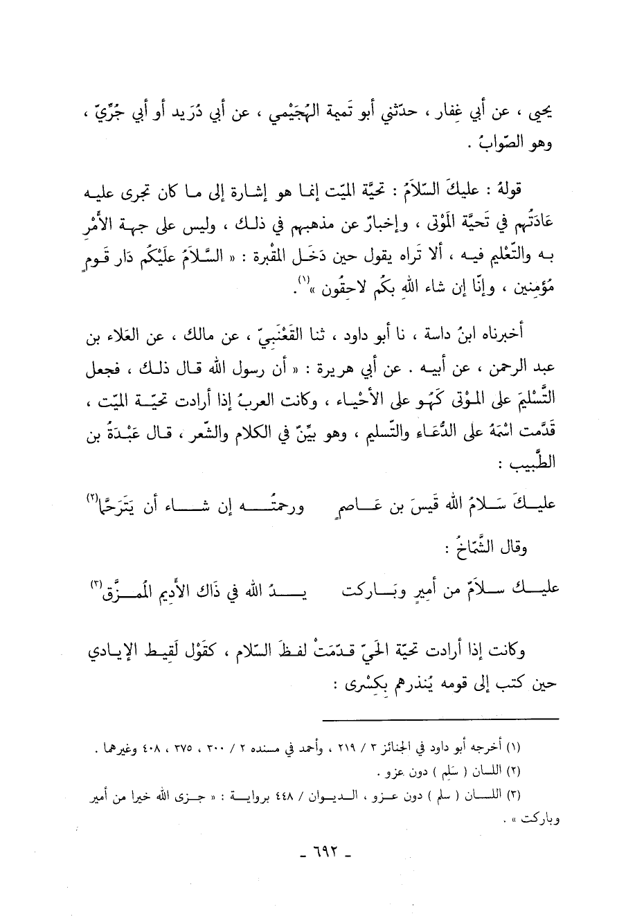 قَوْلُهُ: "عَلَيْكَ السَّلامُ تَحِيَّةُ الْمَيِّتِ" إِنَّمَا هُوَ إِشَارَةٌ إِلَى مَا كَانَ تَجْرِي عَلَيْهِ عَادَتُهُمْ فِي تَحِيَّةِ الْمَوْتَى وَإِخْبَارٌ عَنْ مَذْهَبِهِمْ فِي ذَلِكَ وَلَيْسَ عَلَى جِهَةِ الأَمْرِ بِهِ وَالتَّعْلِيمِ فِيهِ أَلا تَرَاهُ يَقُولُ حِينَ دَخَلَ الْمَقْبُرَةَ: "السَّلامُ علَيْكُمْ دَارَ قَوْمٍ مُؤْمِنِينَ وَإِنَّا إِنْ شَاءَ اللَّهُ بِكُمْ لاحِقُونَ" 1.