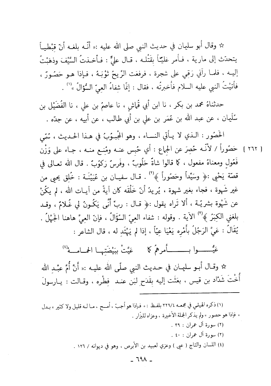 وَقَالَ أَبُو سُلَيْمَانَ فِي حَدِيثِ النَّبِيِّ صَلَّى اللَّهُ عَلَيْهِ وَسَلَّمَ: أَنَّهُ بَلَغَهُ أَنَّ قِبْطِيًّا يَتَحَدَّثُ إِلَى مَارِيَةَ فَأَمَرَ عَلِيًّا بِقَتْلِهِ قَالَ عَلِيٌّ: فَأَخَذْتُ السَّيْفَ وَذَهَبْتُ إِلَيْهِ فَلَمَّا رَآنِي رَقِيَ عَلَى شَجَرَةٍ فَرَفَعَتِ الرِّيحُ ثَوْبَهُ فَإِذَا هُوَ حَصُورٌ. فَأَتَيْتُ النَّبِيَّ عَلَيْهِ السَّلامُ فَأَخْبَرْتُهُ فَقَالَ: "إِنَّمَا شِفَاءُ الْعَيِّ السُّؤَالُ" 1.
