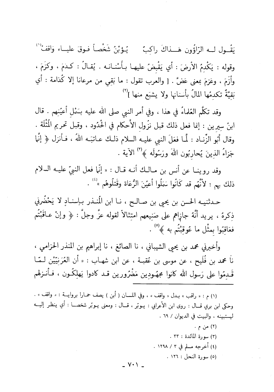 وقد تكلَّم العُلماءُ في هذا وفي أمر النَّبِيّ صَلَّى اللَّهُ عَلَيْهِ وَسَلَّمَ بسَمْل أعيُنهم. قَالَ ابنُ سِيرِين إنّما فعل ذَلِكَ قبل نُزولِ الأَحكام في الحُدُود وقبل تحريم المُثْلَة. وقال أبُو الزِّناد لمَّا فعَلَ النبي عليه السلام ذلك عاتبَه اللهُ فأنزل: {إِنَّمَا جَزَاءُ الَّذِينَ يُحَارِبُونَ اللَّهَ وَرَسُولَهُ} 3 الآية.