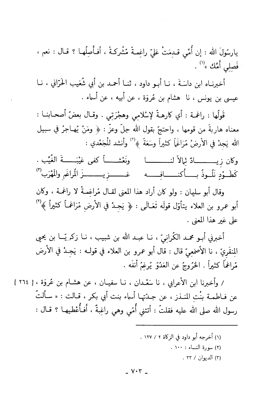 أخبرني أبو محمد الكُرانيّ نا عَبْد اللَّهِ بْنُ شَبِيبٍ نا زَكَرِيَّا بْنُ يَحْيَى الْمِنْقَرِيُّ نا الأَصْمَعِيُّ قَالَ قَالَ أبو عمرو بن العلاء في قوله: يَجِدْ في الأرض مُراغمًا كثيرًا. الخرُوجُ عَنِ العَدُوّ يُرغِمُ أنفَه.