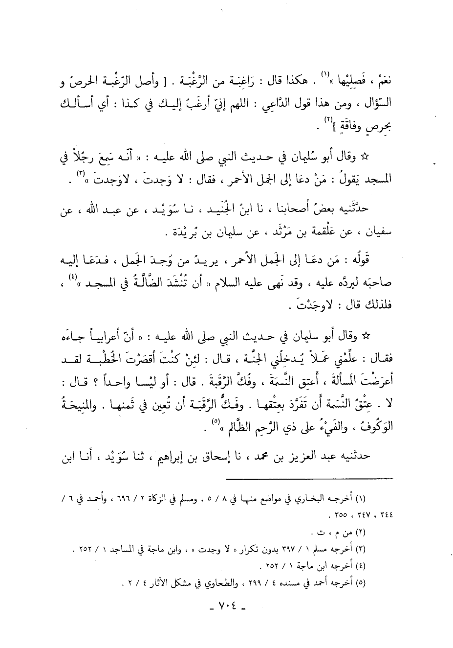 وَقَالَ أَبُو سُلَيْمَانَ فِي حَدِيثِ النَّبِيِّ صَلَّى اللَّهُ عَلَيْهِ وَسَلَّمَ: أَنَّهُ سَمِعَ رَجُلا فِي الْمَسْجِدِ يَقُولُ: مَنْ دَعَا إِلَى الْجَمَلِ الأحمر فقال: "لا وجدت لاوجدت" 1.