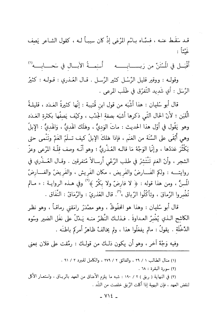 قال أبو سُليمان: هذا أشْبَه من قول ابنِ قُتيبة إنّها كثيرةُ العَدَد قليلةُ اللَّبَن لأنّ الحال التّي ذكرها أشبَه بصفةِ الجَدْب وكيْف يَصِفُها بكثرةِ العَدَد وهو يَقُول في أوّل هذا الحديث ماتَ الوَدِيُّ وهَلَك الهَدِيُّ والهدي الإِبلُ وهي أَبْقَى عَلَى السَّنَة من الغنَم فإذا هَلَكَ الإبلُ كيف تسلَمُ الغَنمُ وتَنْمى حتى يَكْثُرَ عَدَدها وإنّما الوَجْهُ مَا قاله العُذْريُّ وهو أَنَّهُ وصف قِلّة المرْعى وعزّ الشجر وأنّ الغنم تَنْتَشِرُ في طلب الرِّعْي أَرسالًا مُتفرقين. وقال العُذْري: في روايته ولكم الفارض والفريض مكان الفَرِيش والفَرِيضُ والفارِضُ المُسِنُّ ومن هذا قوله: {لا فَارِضٌ وَلا بِكْرٌ} 2 وفي هذه الرواية ما لم تضمروا الرماق وتأكلوا الرياق 3. قَالَ العُذريّ: والرِّمَاقُ النِّفَاق.