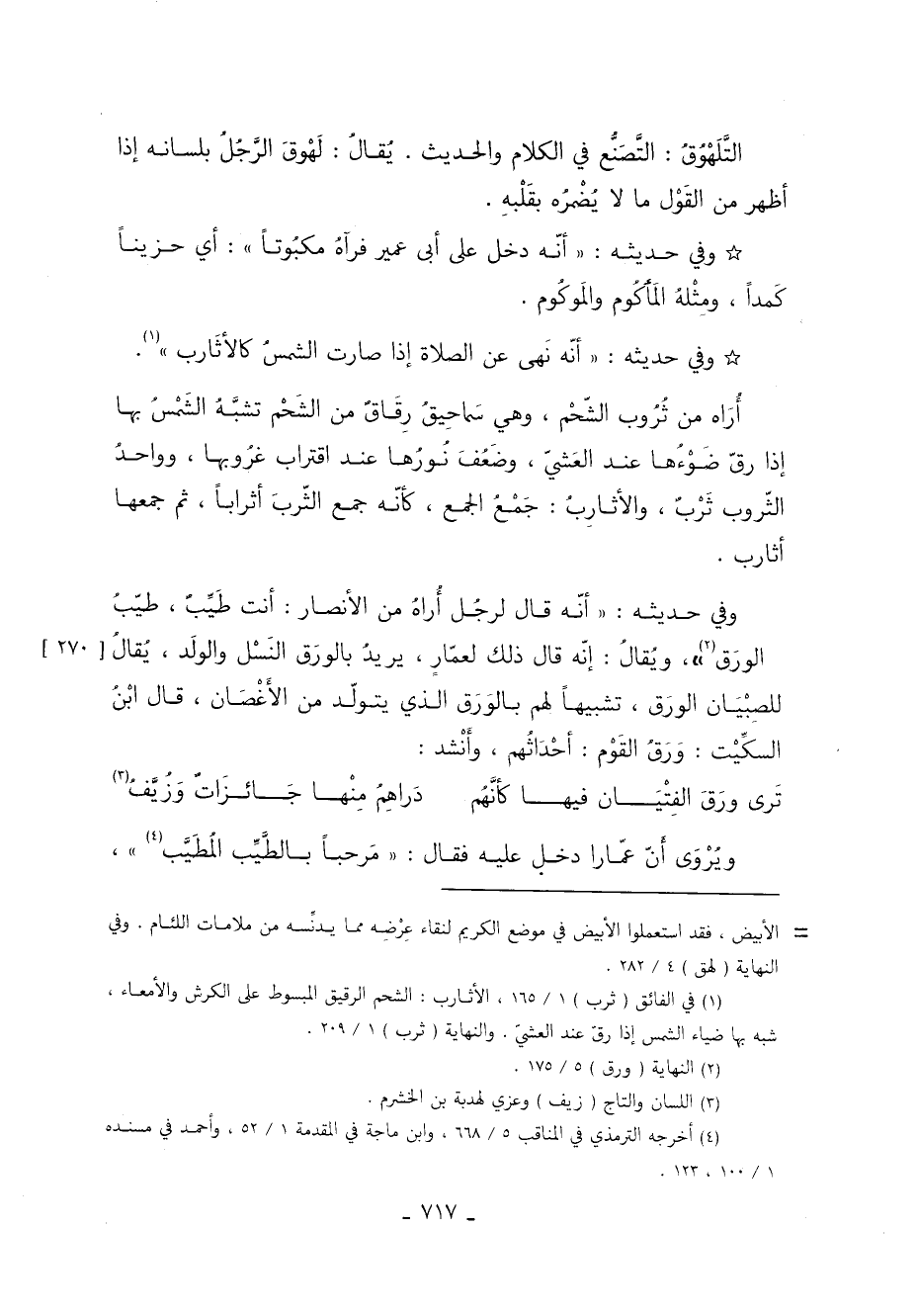 وَفِي حَدِيثِهِ أَنَّهُ قَالَ لِرَجُلٍ أُرَاهُ مِنَ الأَنْصَارِ: "أَنْتَ طَيِّبٌ طَيّبُ الْوَرَقِ" 1. ويُقالُ إنّه قَالَ: ذَلِكَ لعمّارٍ يريدُ بالورَق النَسْل والولَد يُقالُ: للصِبْيَان الورَق تشبيهًا لهم بالوَرَق الَّذِي يتولّد من الأَغْصان قَالَ ابْنُ السِّكيْت وَرَقُ القَوْم أحْدَاثُهم وأَنْشد: