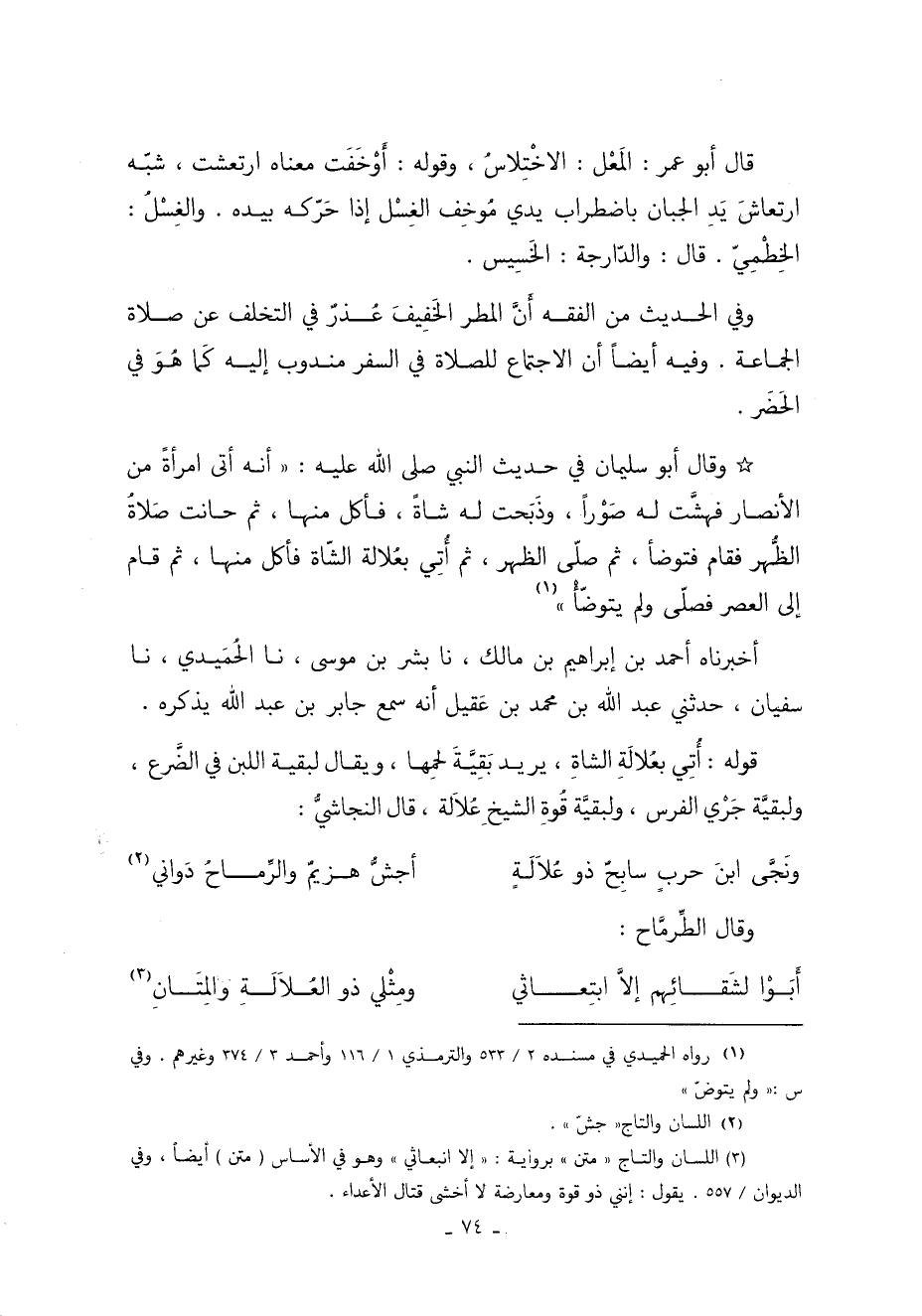 وَقَالَ أَبُو سُلَيْمَانَ فِي حَدِيثِ النبي أَنَّهُ أَتَى امْرَأَةً مِنَ الأَنْصَارِ فَهَشَّتْ لَهُ صَوْرًا وَذَبَحَتْ لَهُ شَاةً فَأَكَلَ مِنْهَا ثُمَّ حَانَتْ صَلاةُ الظُّهْرِ فَقَامَ فَتَوَضَّأَ ثُمَّ صَلَّى الظُّهْرَ ثُمَّ أُتِيَ بِعُلالَةِ الشَّاةِ فَأَكَلَ مِنْهَا ثُمَّ قَامَ إِلَى الْعَصْرِ فَصَلَّى وَلَمْ يَتَوَضَّأْ. 1