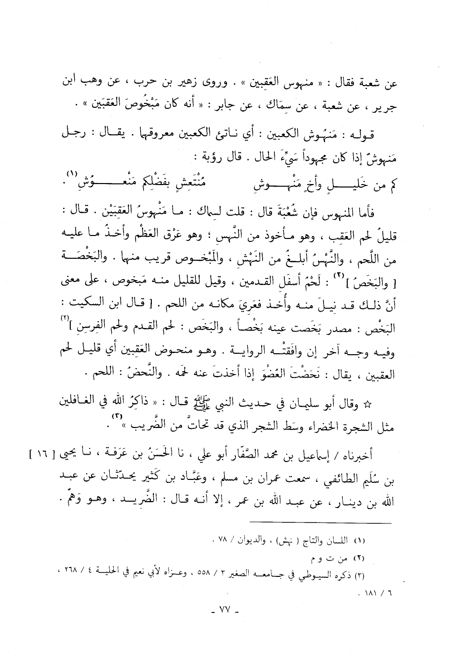 فأما المنهوس فإن شُعْبَةَ قَالَ: قلت لسِماك ما مَنْهوسُ العَقِبَيْن قَالَ: قليلُ لحم العَقِب وهو مأخوذ من النَّهسِ وهو عَرْق العَظْم وأخذُ ما عليه من اللَّحم والنَّهْسُ أبلغُ من النَهْشِ والمَبْخوص قريب منهما والبَخْصَة [والبَخَصُ] لَحْمُ أسفَلِ القدمين وقيل للقليل منه مَبخوص عَلَى معنى أنَّ ذَلِكَ قد نِيلَ منه وأُخذ فعَرِيَ مكانه من اللحم [قَالَ ابن السكيت البَخْص مصدر بَخَصت عينه بَخْصًا والبَخَص لحم القدم ولحم الفِرسِنِ] 2 وفيه وجه آخر إن وافَقتْه الرواية وهو منحوض العَقِبين أي قليل لحم العقبين يقال نخضت الْعُضْوَ إذا أخذتَ عنه لحَمه والنحض اللحم.