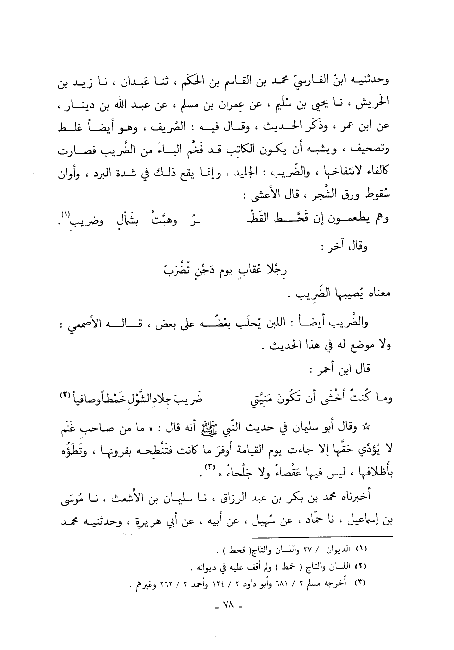 وَحَدَّثَنِيهِ ابْنُ الْفَارِسِيِّ مُحَمَّدُ بْنُ الْقَاسِمِ بْنِ الْحَكَمِ ثنا عَبْدَانُ نا زَيْدُ بْنُ الْحَرِيشِ نا يَحْيَى بْنُ سُلَيْمٍ عَنْ عِمْرَانَ بْنِ مُسْلِمٍ عَنْ عَبْدِ اللَّهِ بْنِ دِينَارٍ عَنِ ابْنِ عُمَرَ وَذَكَرَ الْحَدِيثَ وقال فيه الصَّريف وهو أيضًا غلط وتصحيف ويشبه أن يكون الكاتِب قد فَخَّم الباءَ من الضَّريب فصارت كالفاء لانتفاخها والضّريب الجليد وإنما يقع ذَلِكَ في شدة البرد وأوان سُقوط ورق الشَّجر قَالَ الأعشى: