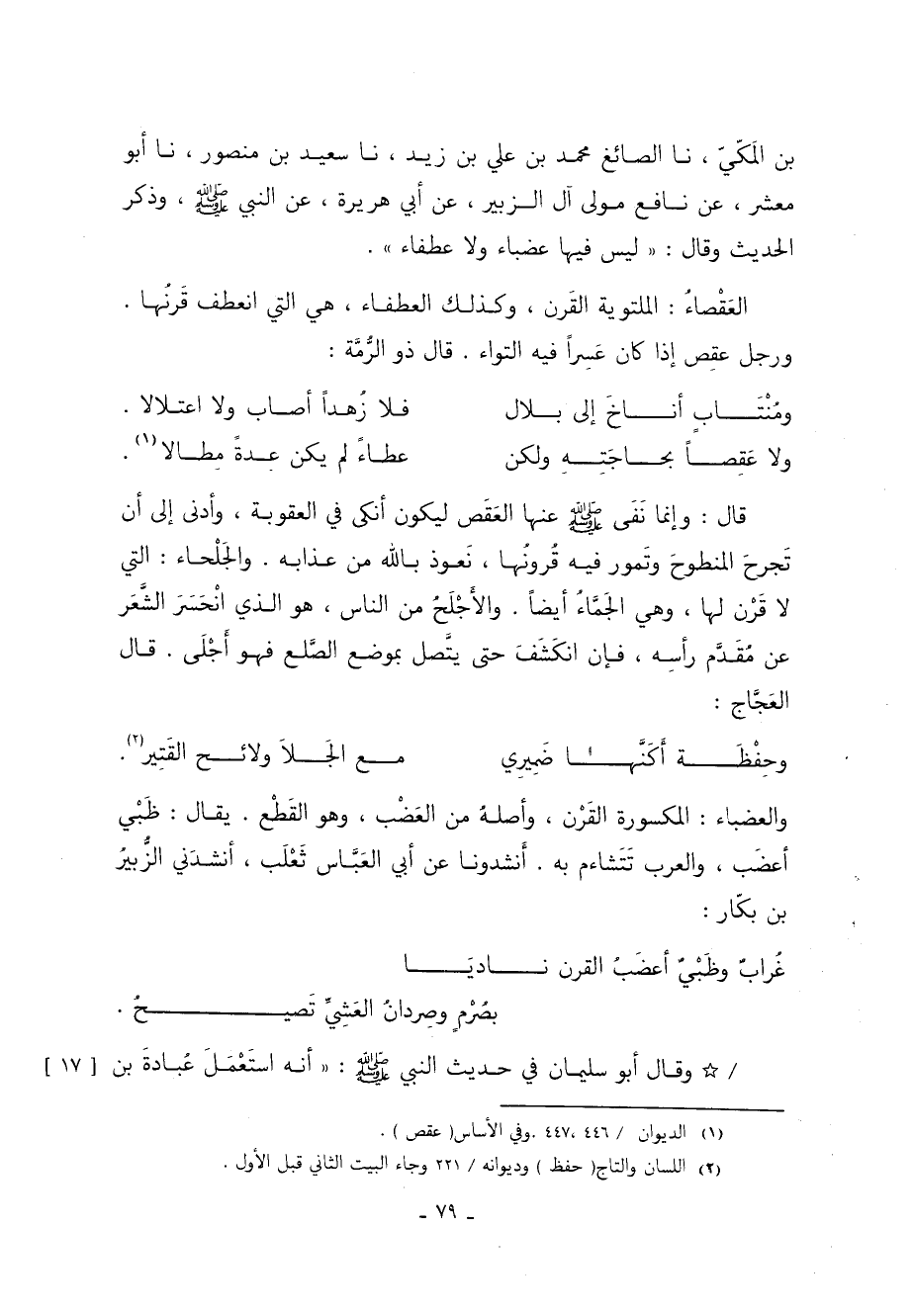 بْنُ الْمَكِّيِّ نا الصَّائِغُ مُحَمَّدُ بْنُ عَلِيِّ بْنِ زَيْدٍ نا سَعِيدُ بْنُ مَنْصُورٍ نا أَبُو مَعْشَرٍ عَنْ نَافِعٍ مَوْلَى آلِ الزُّبَيْرِ عَنْ أَبِي هُرَيْرَةَ عَنِ النبي وَذَكَرَ الْحَدِيثَ وَقَالَ: "لَيْسَ فِيهَا عَضْبَاءُ وَلا عَطْفَاءُ"
