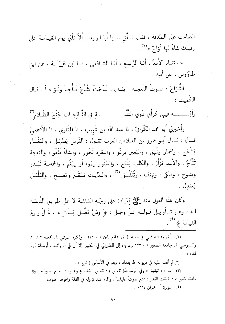 1 أخرجه الشافعي في سننه كما في بدائع المنن 1/ 242, وذكره البيثمي في معجمه 3/ 86 والسيوطي في جامعه الصغير 1/ 123 وعزاه إلى الطبراني في الكبير إلا أن في الزوائد"أوشاة لها ثغاء".