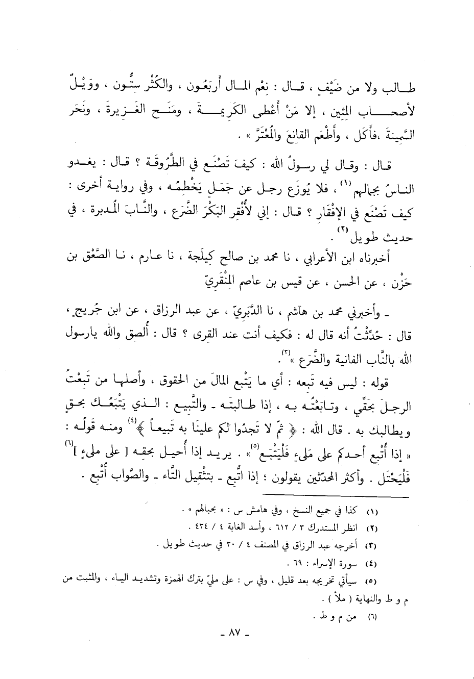 وَقَالَ أَبُو سُلَيْمَانَ فِي حَدِيثِ النبي إِنَّ قَيْسَ بْنَ عَاصِمٍ الْمِنْقَرِيَّ قَالَ أَتَيْتُهُ فَقُلْتُ يَا رَسُولَ اللَّهِ مَا الْمَالُ الَّذِي لَيْسَ فِيهِ تَبِعَةٌ مِنْ طَالِبٍ وَلا مِنْ ضَيْفٍ قَالَ: "نِعْمَ الْمَالُ أَرْبَعُونَ وَالْكُثْرُ سِتُّونَ وَوَيْلٌ لأَصْحَابِ الْمِئِينَ إِلا مَنْ أَعْطَى الْكَرِيمَةَ وَمَنَحَ الْغَزِيرَةَ وَنَحَرَ السَّمِينَةَ فَأَكَلَ وَأَطْعَمَ الْقَانِعَ وَالْمُعْتَرَّ"