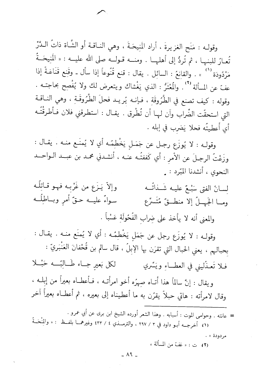 وقوله: مَنَح الغزيرة أراد المَنِيحَةَ وهي الناقة أو الشَّاة ذاتُ الدَّرِّ تُعارُ للبنها ثُمَّ تُردُّ إلى أهلها ومنه قوله صَلَّى اللَّهُ عَلَيْهِ وَسَلَّمَ: "المَنِيحَةُ مَرْدُودَة 1" والقانِعُ السائِل يقال قنع قُنُوعًا إذا سأل وقَنِع قَنَاعَةً إذا عف عن المسألة 2 والمُعْتَرُّ الَّذِي يغشاك ويتعرض لك ولا يفصح بحاجته وقوله: كيف "تصنع فِي الطروقة" فإنه يريد فحلالطروقة وهي الناقة التي استحقّت الضِّراب وآن لها أن تُطْرق يقال استطرقني فلان فأطرقْتُه أي أَعطيتُه فحلا يَضرِب في إبله.