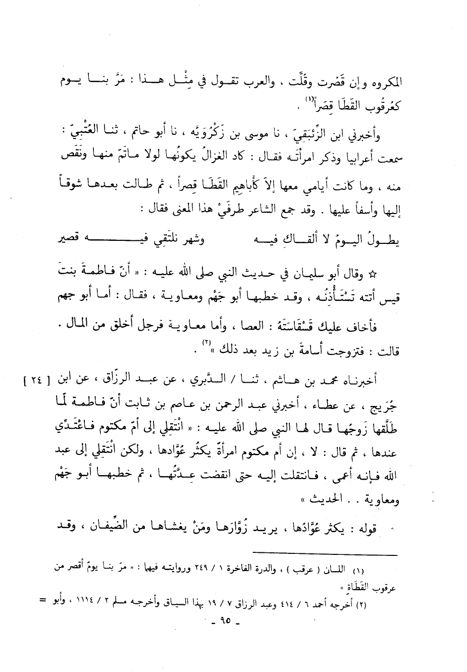 وأخبرني ابن الزِّئبَقِيّ نا موسى بن زَكْرُوَيَّه نا أبو حاتم ثنا العُتْبِيّ سمعت أعرابيًا وذكر امرأته فقال كاد الغزال يكونُها لولا ما تَمّ منها ونَقَص منه وما كانت أيامي معها إلا كأَباهِيم القَطَا قِصرًا ثُمَّ طالت بعدها شوقًا إليها وأسفًا عليها وقد جمع الشاعر طرفَيْ هذا المعنى فَقَالَ: