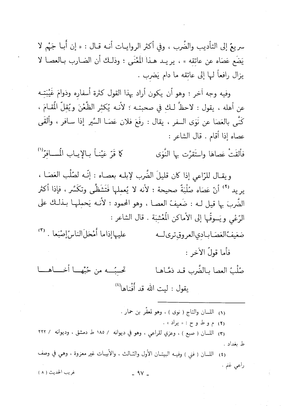 ويقال للرّاعي إذا كان قليلَ الضَّرب لإبله بعصاه إنّه لصُلْب العَصَا يريد 2 أنّ عَصَاه صُلْبَةً صحيحة لأنه لا يُعمِلها فَتُشَظَّى وتكَسَّر فإذا أكثر الضَّربَ بها قيل له ضَعيفُ العصا وهو المحمود لأنه يَحمِلها بذلك عَلَى الرّعْي ويَسوقُها إلى الأماكن المُعْشِبَة قَالَ الشاعر: