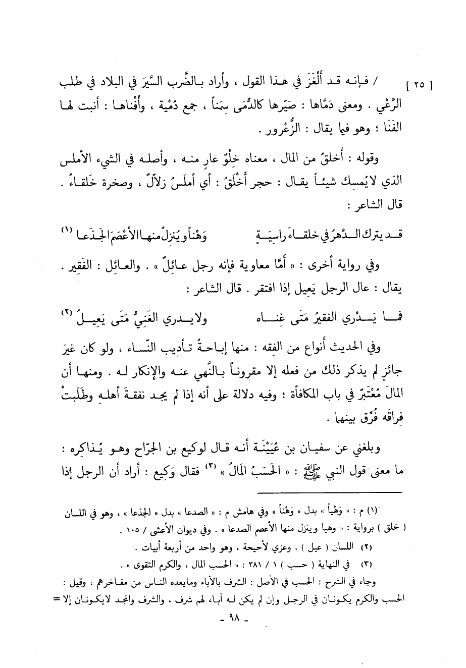 وبلغني عن سفيان بن عُيَيْنَة أنه قَالَ لوكيع بن الجرّاح وهو يُذاكِره ما معنى قول النَّبِيّ صَلَّى اللَّهُ عَلَيْهِ وَسَلَّمَ: "الحَسَب المَالُ" 3 فَقَالَ وَكِيع أراد أن الرجل إذا