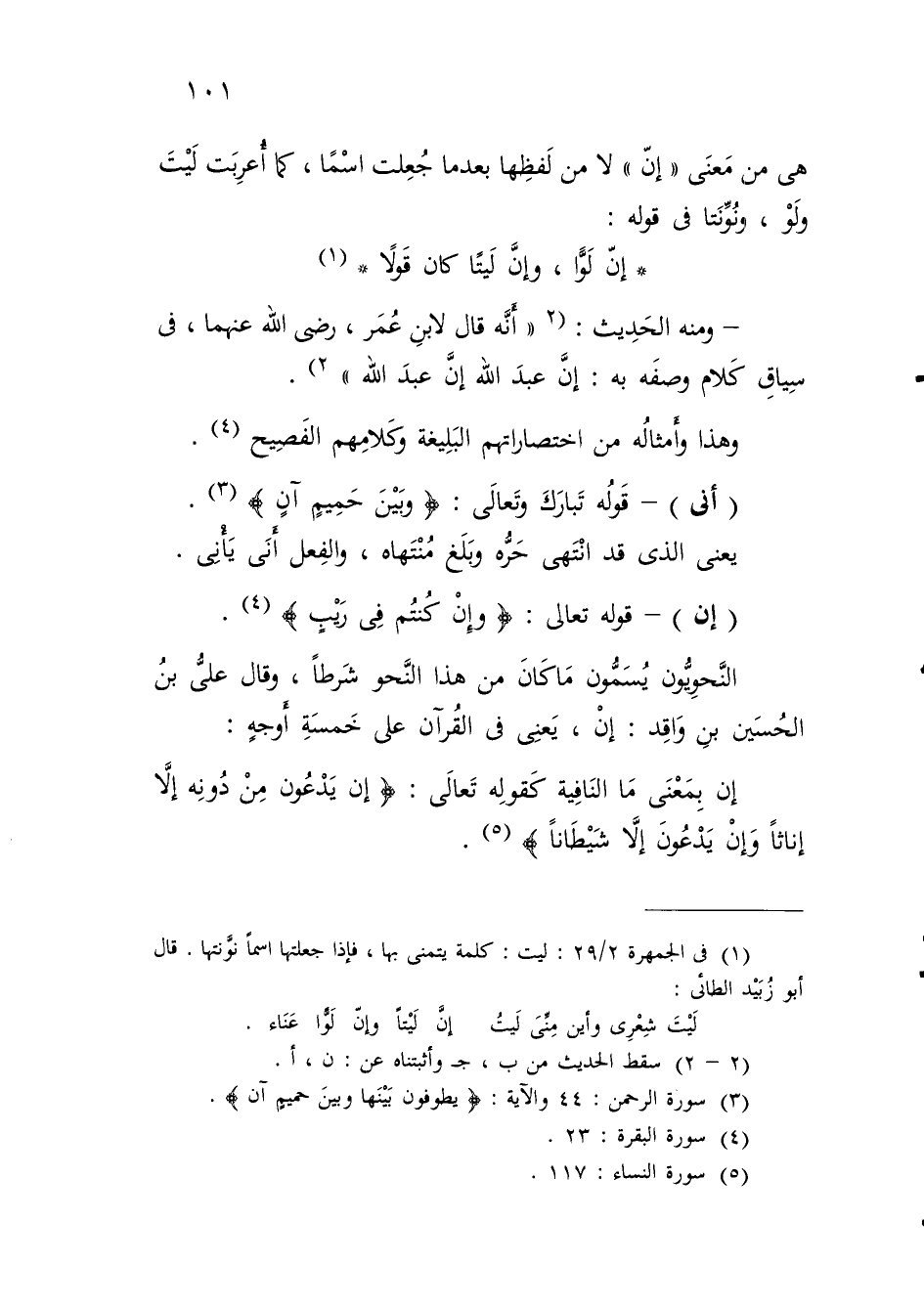إن بِمَعْنَى مَا النَافِية كَقولِه تَعالَى: {إِنْ يَدْعُونَ مِنْ دُونِهِ إِلَّا إِنَاثًا وَإِنْ يَدْعُونَ إِلَّا شَيْطَانًا} (¬5).