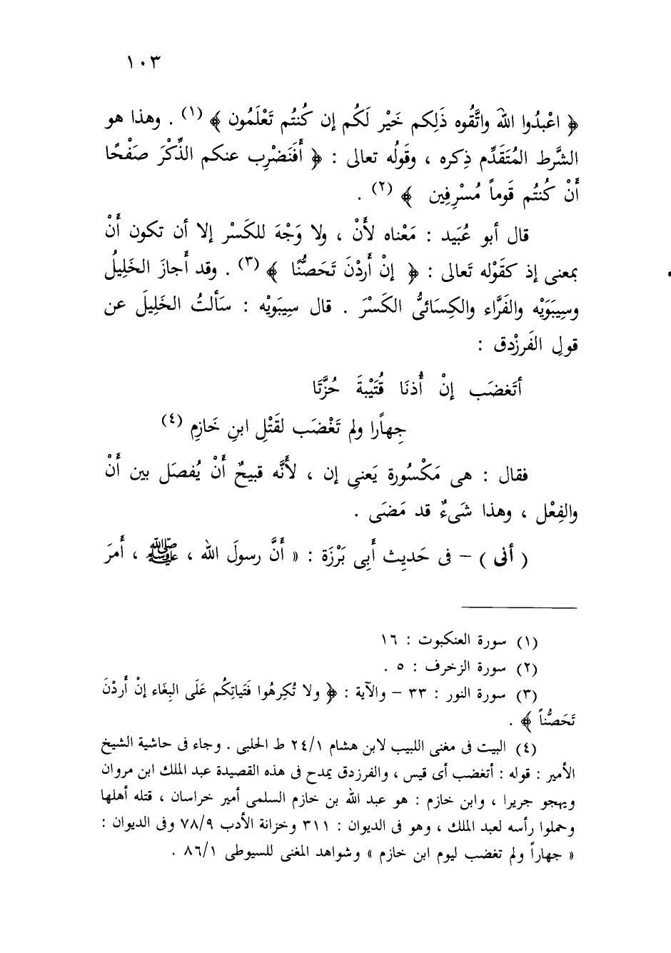 (¬4) البيت في مغنى اللبيب لابن هشام 1/ 24 ط الحلبى. وجاء في حاشية الشيخ الأمير: قوله: أتغضب أي قبس، والفرزدق يمدح في هذه القصيدة عبد الملك ابن مروان ويهجو جريرا، وابن خازم: هو عبد الله بن خازم السلمى أمير خراسان، قتله أهلها وحملوا رأسه لعبد الملك، وهو في الديوان: 311 وخزانة الأدب 9/ 78 وفي الديوان: "جهاراً ولم تغضب ليوم ابن خازم" وشواهد المغنى للسيوطى 1/ 86.