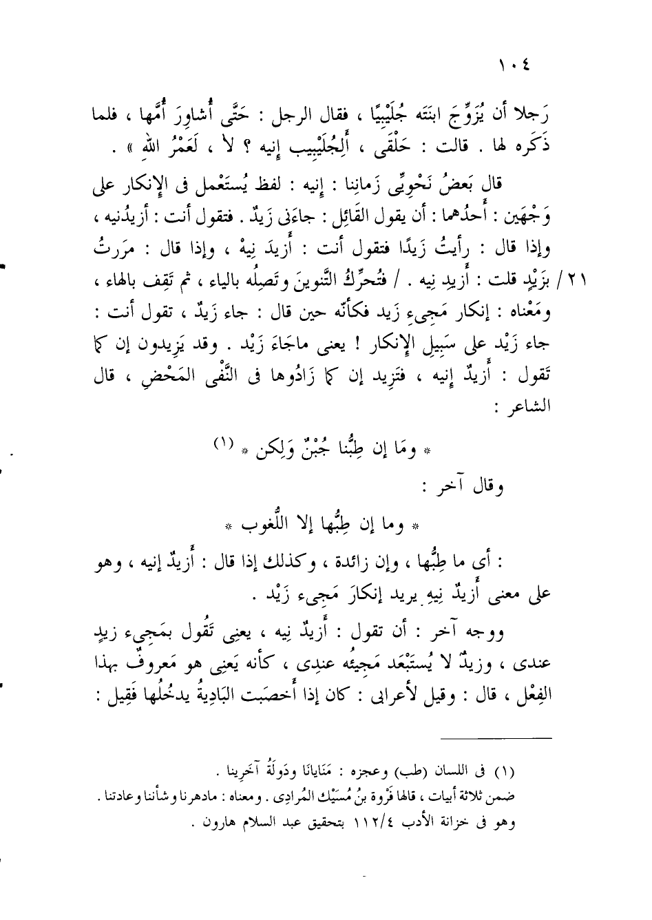 قال بَعضُ نَحوِيَّى زَمانِنا: إِنيه: لفظ يُستَعْمل في الِإنكار على وَجْهَين: أَحدُهما: أن يقول القائِل: جاءَنى زَيدٌ. فتقول أنت: أزيدُنيه، وإذا قال: رأيتُ زَيدًا فتقول أنت: أزيدَ نِيهْ، وإذا قال: مرَرتُ بزَيْد قلت: أَزيِد نِيه. فتُحرِّكُ التَّنوينَ وتَصِلُه بالياء، ثمَّ تَقِف بالهاء، ومَعْناه: إنكار مَجِىءِ زَيد فكأنّه حين قال: جاء زَيدٌ، تقول أنت: جاء زَيْد على سَبِيلِ الِإنكار! يعني ما جاءَ زَيْد. وقد يَزِيدون إن كما تَقول: أَزيدٌ إنيه، فتَزِيد إن كما زادُوها في النَّفْى المَحْضِ، قال الشاعر: