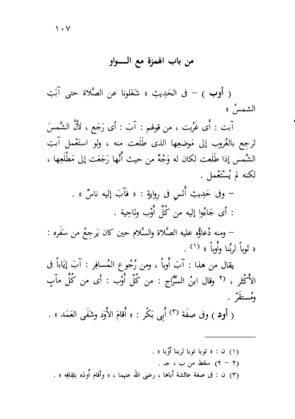 (أوب) - في الحَدِيثِ "شَغَلونا عن الصَّلاة حتى آبَتِ الشمسُ"