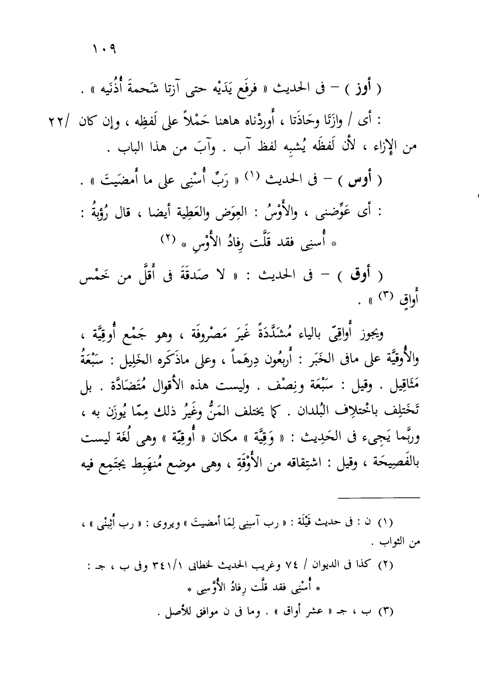 ويجوز أواقِىّ بالياء مُشَدَّدَةً غَيرَ مَصروفَة، وهو جَمْع أُوقِيَّة، والأُوقيَّة على ما في الخَبَر: أَربعُون دِرهَماً، وعلى ما ذَكَره الخَلِيل: سَبْعَةُ مَثاقِيل. وقيل: سَبْعَة ونِصْف. وليست هذه الأقوال مُتَضادَّة. بل تَخَتلِف باخْتلاِف البُلدان. كما يختلف المَنُّ وغَيرُ ذلك مِمّا يُوزَن به، وربَّما يَجِىء في الحَدِيث: "وَقِيَّة" مكان "أُوقِيّة" وهي لُغَة ليست بالفَصِيحَة، وقيل: اشتِقاقه من الأَوْقَةِ، وهي موضع مُنهَبِط يجتَمِع فيه