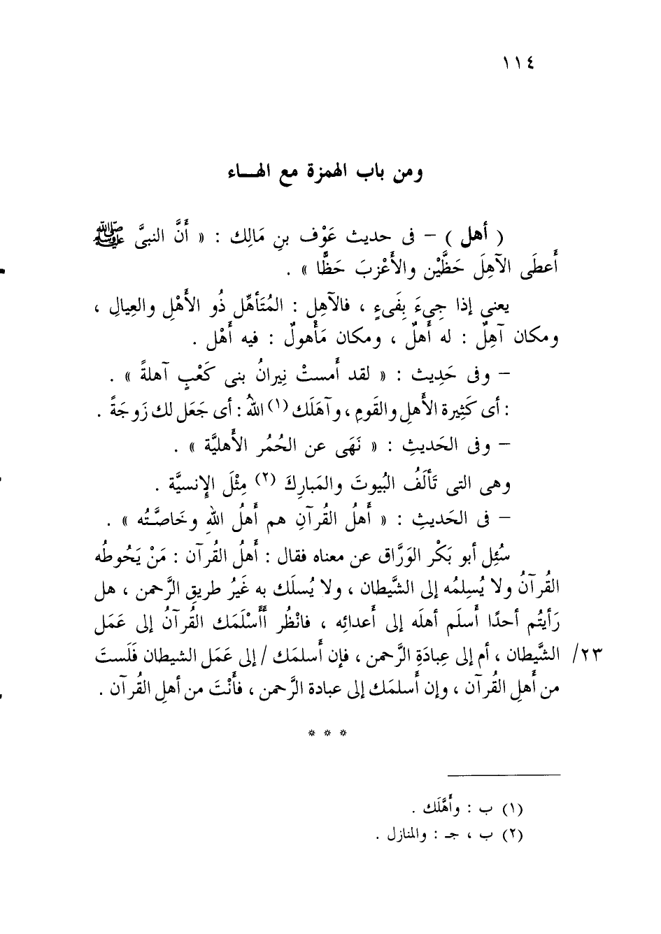 (أهل) - في حديث عَوْف بنِ مَالِك: "أنَّ النبىَّ - صلى الله عليه وسلم - أعطىَ الآهِلَ حَظَّيْن والأَعْزبَ حَظًّا".