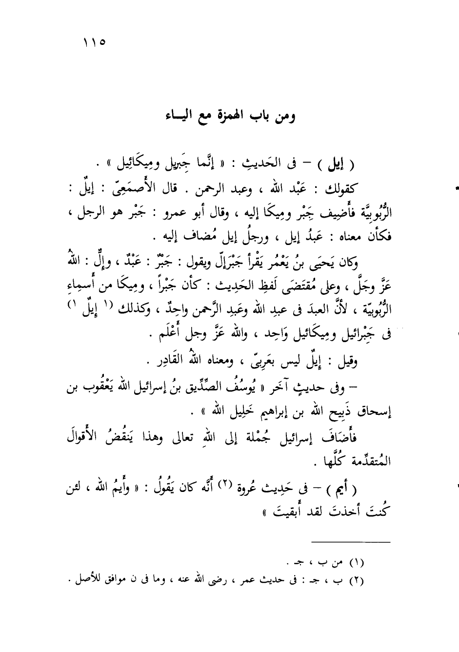 كقولك: عَبْد الله، وعبد الرحمن. قال الأصمَعِىّ: إيلٌ: الرُّبُوبِيَّة فأَضِيف جِبْر ومِيكَا إليه، وقال أبو عمرو: جَبْر هو الرجل، فكأن معناه: عَبدُ إيل، ورجلُ إيل مُضاف إليه.