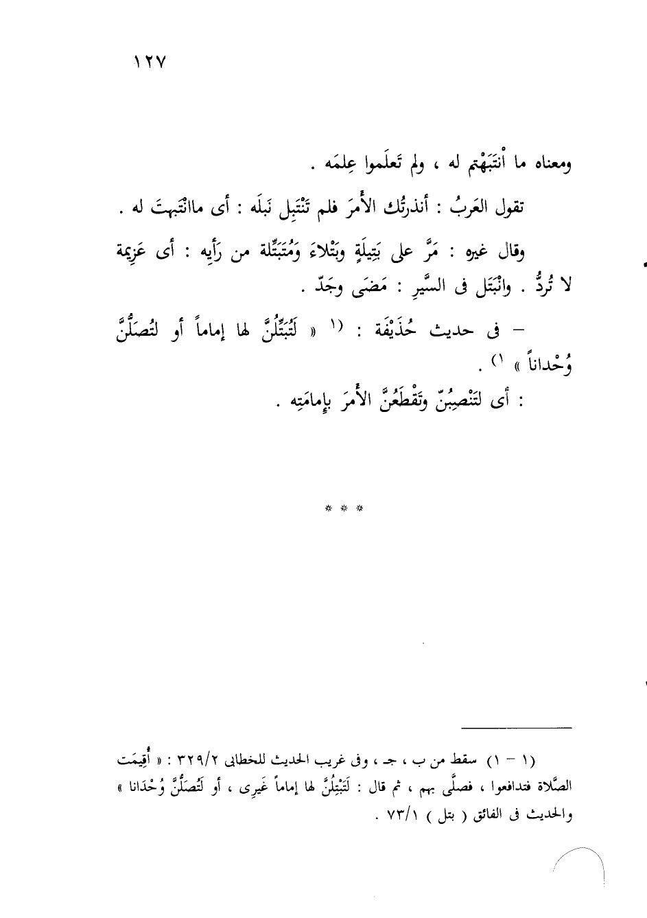 - في حديث حُذَيْفَة: (1 "لَتُبَتِّلُنَّ لها إماماً أو لتُصَلُّنَّ وُحْداناً" 1).