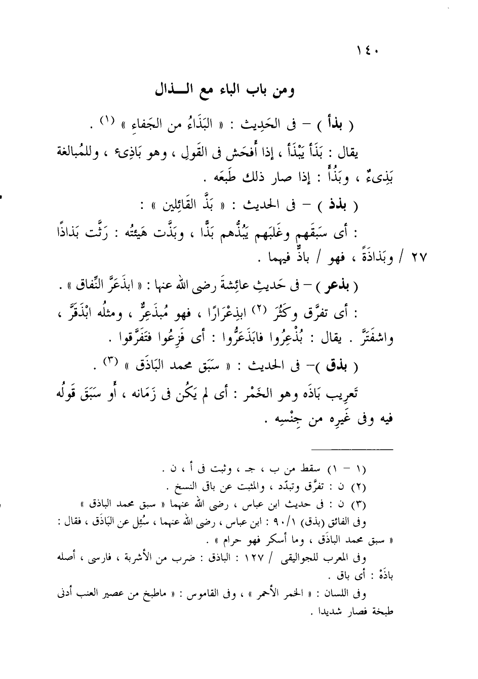 وفي الفائق (بذق) 1/ 90: ابن عباس، رضي الله عنهما، سُئِل عن البَاذَق، فقال: "سبق محمَّد الباذَق، وما أسكر فهو حرام".