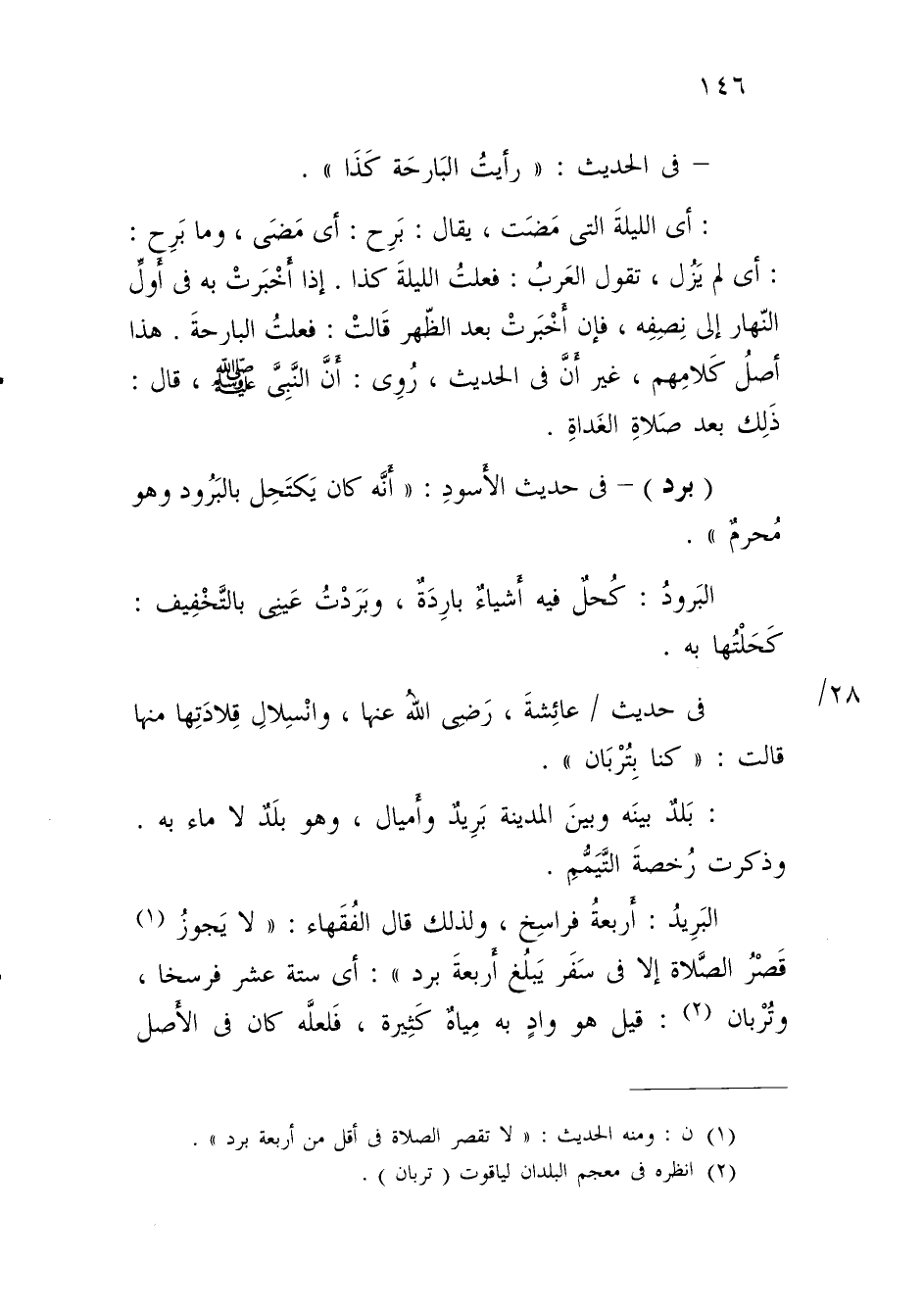 (¬1) ن: ومنه الحديث: "لا تقصر الصلاة في أقل من أربعة برد".