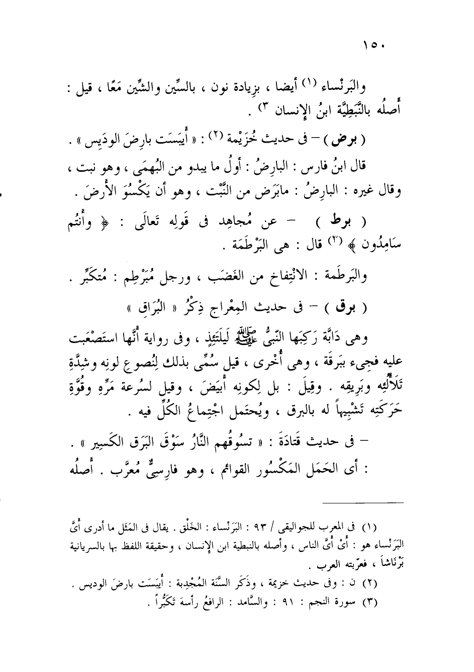 (¬1) في المعرب للجواليقى/ 93: البَرَنْساء: الخَلْق. يقال في المَثَل ما أدرى أيَّ البَرَنْساء هو: أَىْ أَىَّ الناس، وأصله بالنبطية ابن الِإنسان، وحقيقة اللفظ بها بالسريانية بَرْنَاشاَ، فعرّبته العرب.
