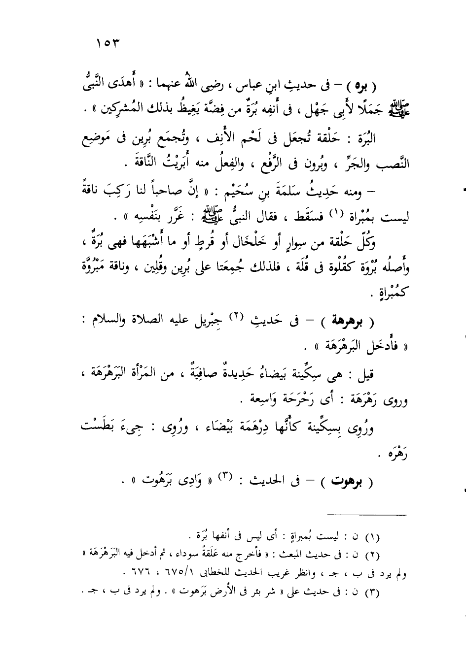 (بره) - في حديثِ ابنِ عباس، رضِى اللهُ عنهما: "أَهدَى النَّبىُّ - صلى الله عليه وسلم - جَمَلًا لأَبِى جَهْل، في أَنفِه بُرَةٌ من فِضَّة يَغِيظُ بذلك المُشركِين".