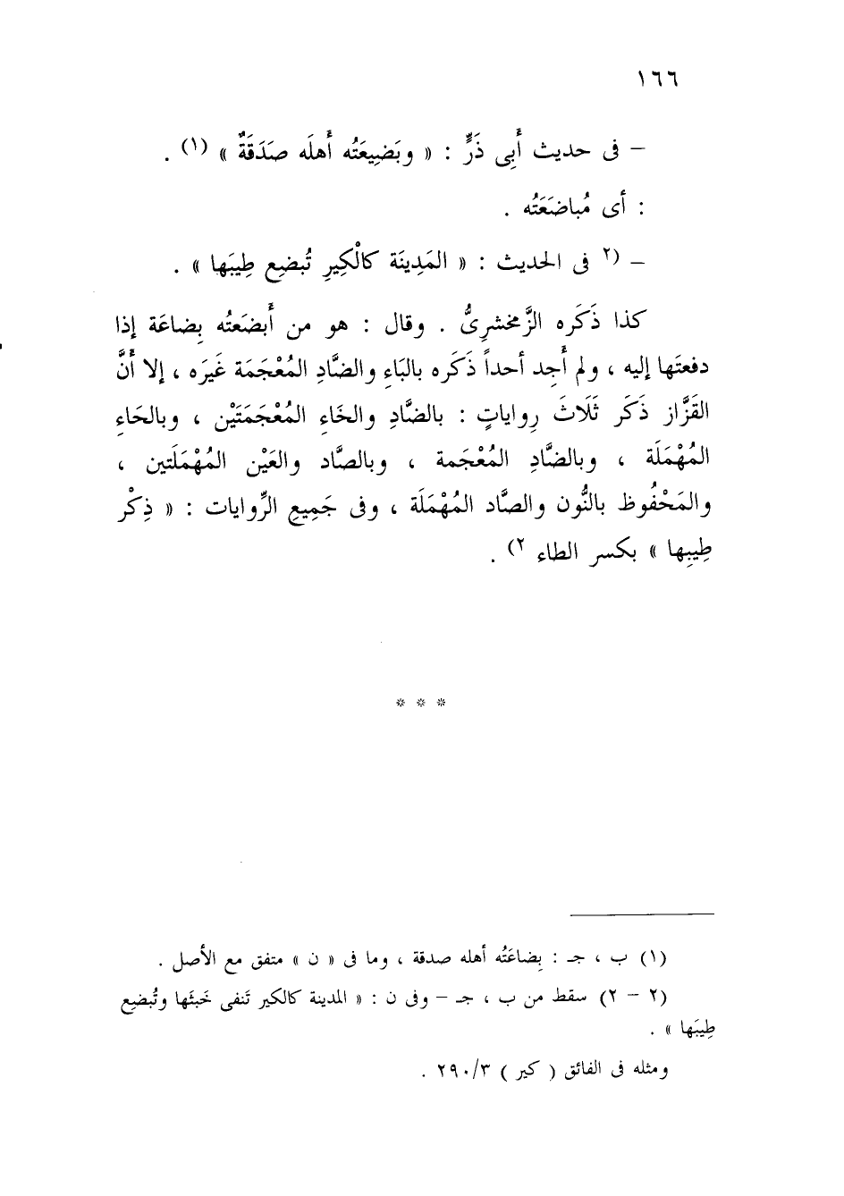 كذا ذَكَره الزَّمخشرِىُّ. وقال: هو من أبضَعتُه بِضاعَة إذا دفعتَها إليه، ولم أَجِد أحداً ذَكَره بالبَاءِ والضَّادِ المُعْجَمَة غَيرَه، إلا أَنَّ القَزَّاز ذَكَر ثَلَاثَ رِواياتٍ: بالضَّادِ والخَاءِ المُعْجَمَتَيْن، وبالحَاءِ المُهْمَلَة، وبالضَّادِ المُعْجَمة، وبالصَّاد والعَيْن المُهْمَلَتين، والمَحْفُوظ بالنُّون والصَّاد المُهْمَلَة، وفي جَمِيعِ الرِّوايات: "ذِكْر طِيبِها" بكسر الطاء 2).