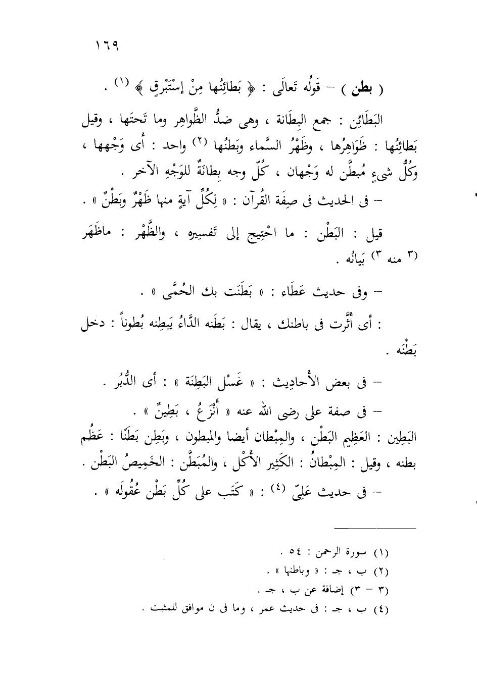 (بطن) - قَولُه تَعالَى: {بَطائِنُها مِنْ إسْتَبْرقٍ} (¬1).