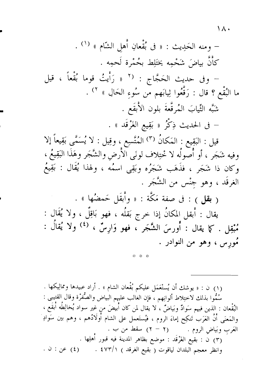 - ومنه الحَدِيث: "في بُقْعانِ أَهلِ الشّام" (¬1).