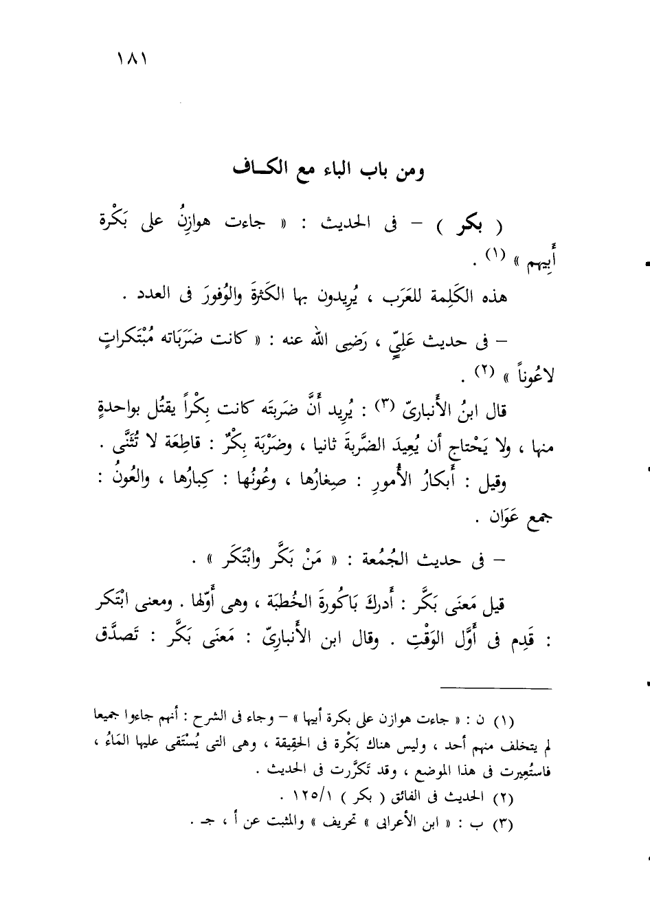 (¬1) ن: "جاءت هوازن على بكرة أبيها" - وجاء في الشرح: أنهم جاءوا جميعا لم يتخلف منهم أحد، وليس هناك بَكْرة في الحقِيقة، وهي التي يُسْتَقى عليها المَاءُ، فاستُعيِرت في هذا الموضع، وقد تَكرَّرت في الحديث.