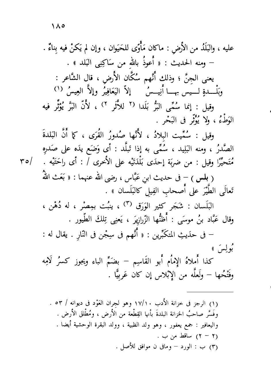 وقيل: إنما سُمِّى البَرُّ بَلَدا (2 للأَثَر 2)، لأَنّ البَرَّ يُؤثِّر فيه الوَطْءُ، ولا يُؤَثّر في البَحْر.