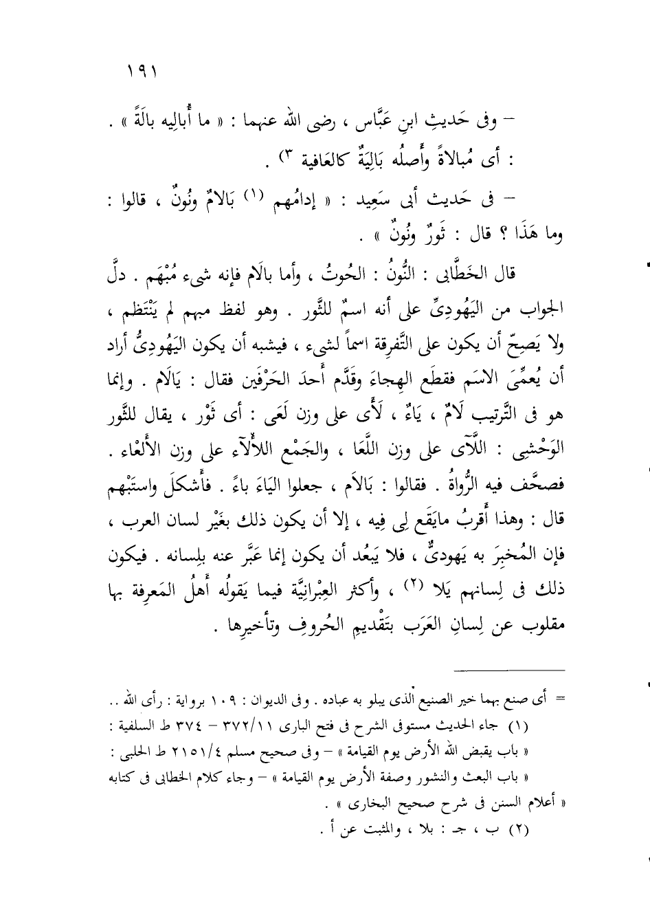 قال الخَطَّابى: النُّونُ: الحُوتُ، وأما بالَام فإنه شىء مُبْهم. دلَّ الجواب من اليَهُودِىِّ على أنه اسمٌ للثَّور. وهو لفظ مبهم لم يَنْتَظم، ولا يَصِحّ أن يكون على التَّفرِقة اسماً لشىء، فيشبه أن يكون اليَهُودِىُّ أراد أن يُعمِّىَ الاسَم فقطَع الهِجاءَ وقَدَّم أحدَ الحَرْفَين فقال: يَالَام. وإنما هو في التَّرتيب لَامٌ، يَاءٌ، لَأَى على وزن لَعَى: أي ثَوْر، يقال للثَّور الوَحْشِى: اللَّآى على وزن اللَّعَا، والجَمع اللأْلآء على وزن الأَلعاء. فصحَّف فيه الرُّواةُ. فقالوا: بَالاَم، جعلوا اليَاءَ باءً. فأَشكلَ واستَبْهم قال: وهذا أَقربُ ما يَقَع لِى فِيه، إلا أن يكون ذلك بغَيْر لسان العرب، فإن المُخبِرَ به يَهودىٌّ، فلا يَبعُد أن يكون إنما عَبَّر عنه بلِسانه. فيكون ذلك في لِسانهم يَلا (¬2)، أكثر العِبْرانِيَّة فيما يَقولُه أَهلُ المَعرِفة بها مقلوب عن لِسانِ العَرَب بتَقْديمِ الحُروفِ وتأخيرِها.