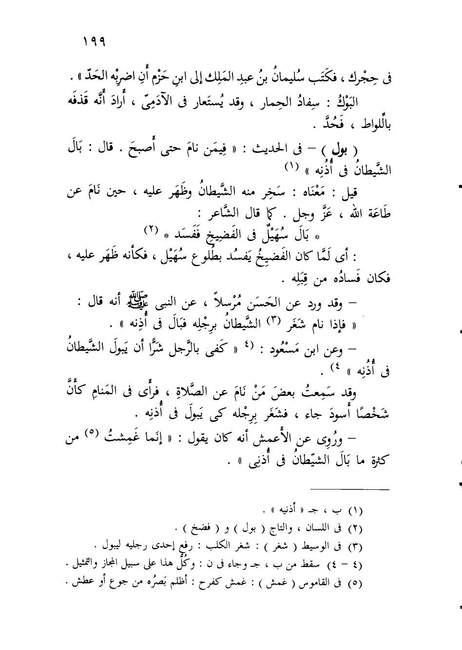 (بول) - في الحديث: "فِيمَن نامَ حتى أَصبحَ. قال: بَالَ الشَّيطانُ في أُذُنِه" (¬1)