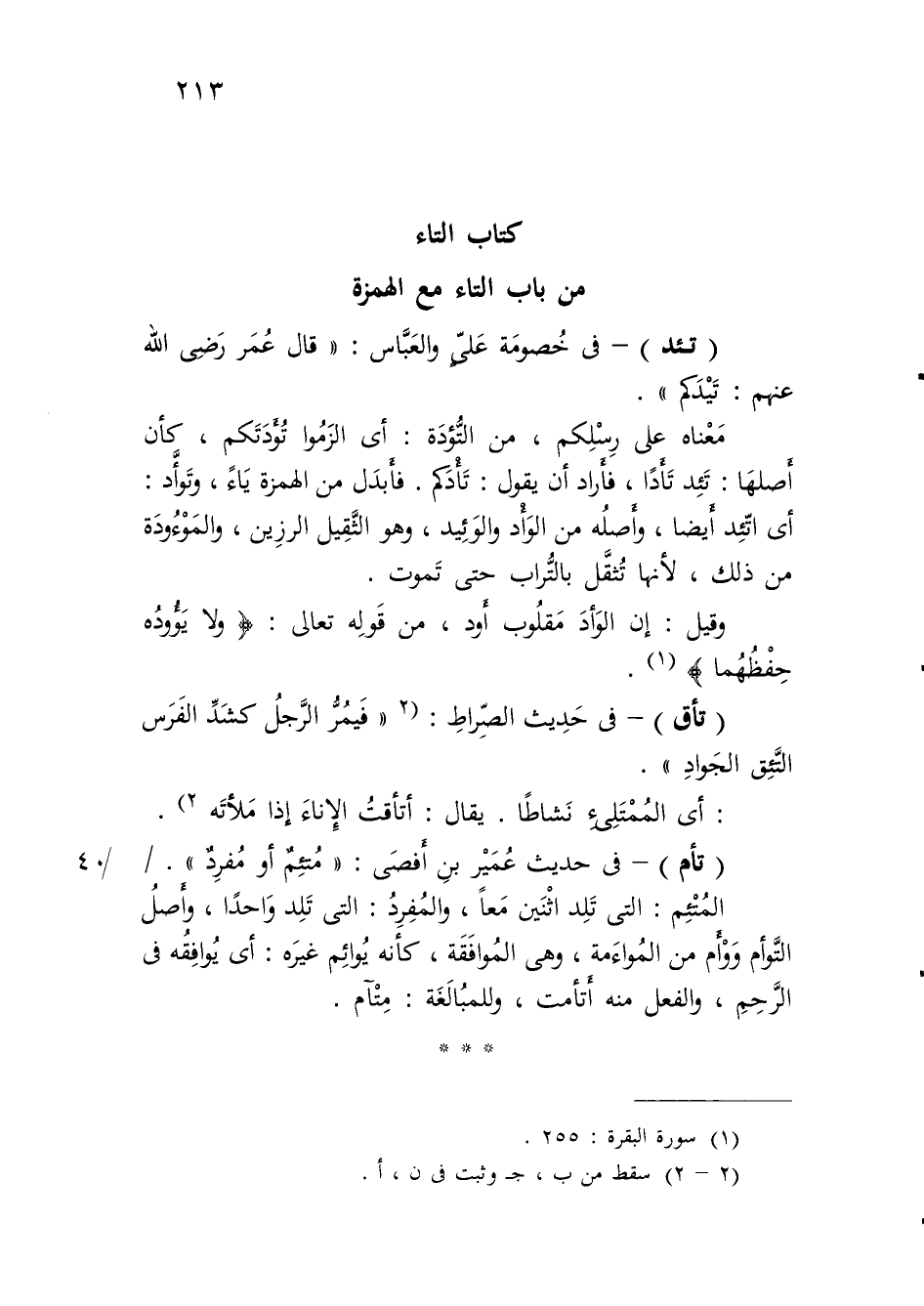 (تئد) - في خُصومَة عَلىًّ والعَبَّاس: "قال عُمَر رَضِى الله عنهم: تَيْدَكم".