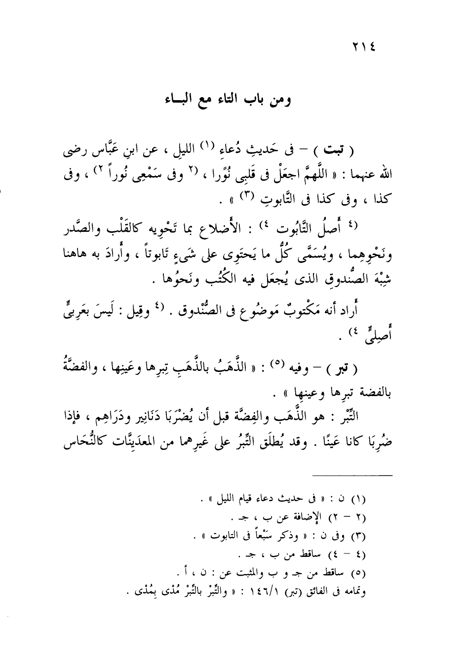 (تبت) - في حَديثِ دُعاءِ (¬1) الليلِ، عن ابنِ عَبَّاس رضي الله عنهما: "اللَّهمَّ اجعَلْ في قَلبِى نُورًا، (2 وفي سَمْعِى نُوراً 2)، وفي كذا، وفي كذا في التَّابوتِ (¬3) ".