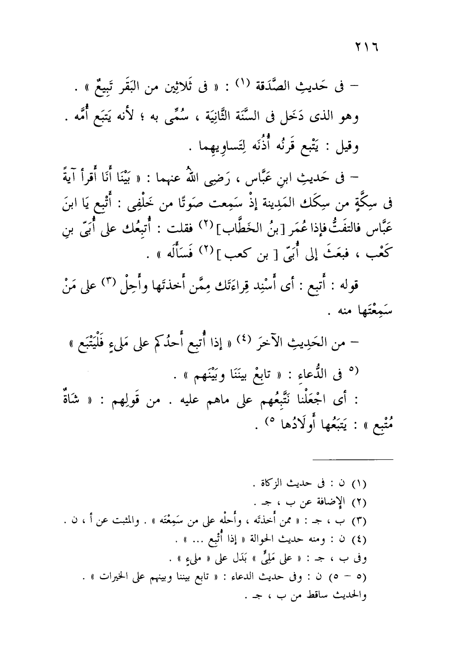 - في حَديثِ ابنِ عَبَّاس، رَضِى اللهُ عنهما: "بَيْنَا أَنَا أَقرأ آيةً في سِكَّةٍ من سِكَك المَدِينة إذْ سَمِعت صَوتًا من خَلْفِى: أَتْبِع يَا ابنَ عَبَّاس فالتفَتُّ فإذا عُمَر [بنُ الخَطَّاب] (¬2) فقلت: أُتبِعُك على أُبَيّ بنِ كَعب، فبعَثَ إلى أُبَىّ [بن كعب] (2) فَسَأَلَه".