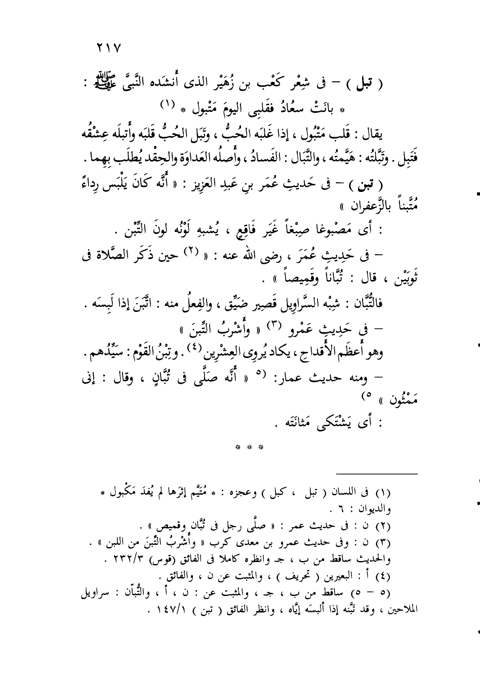 (تبل) - في شِعْر كَعْب بن زُهَيْر الذي أَنشَده النَّبىَّ - صلى الله عليه وسلم -: