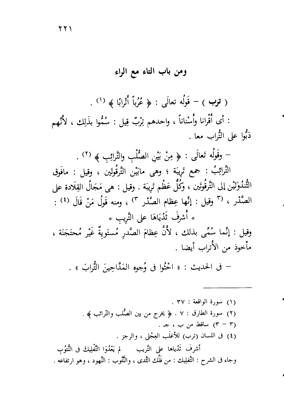 وقيل: إنَّما سُمِّى بذلك، لأنَّ عِظامَ الصَّدرِ مُستَويِةٌ غَيْر مُحتَجَنَة، مأخوذ من الأَتراب أيضا.