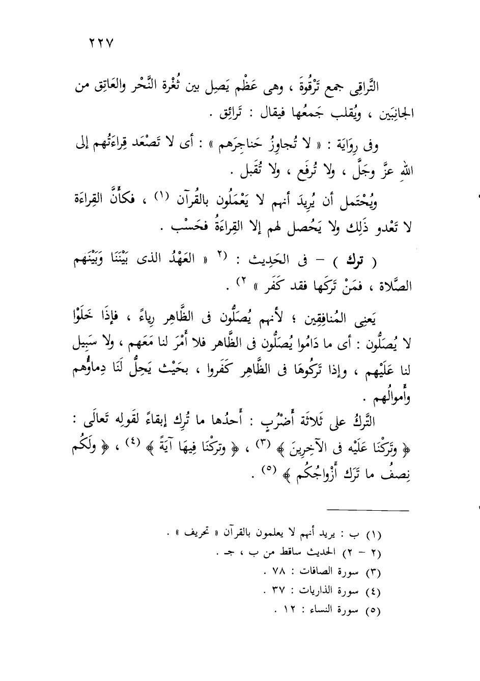 التَّركُ على ثَلاثَة أَضْرُبٍ: أَحدُها ما تُرِك إبقاءً لقَولِه تَعالَى: {وَتَرَكْنَا عَلَيْهِ فِي الْآخِرِينَ} (¬3)، {وَتَرَكْنَا فِيهَا آيَةً} (¬4)، {وَلَكُمْ نِصْفُ مَا تَرَكَ أَزْوَاجُكُمْ} (¬5).