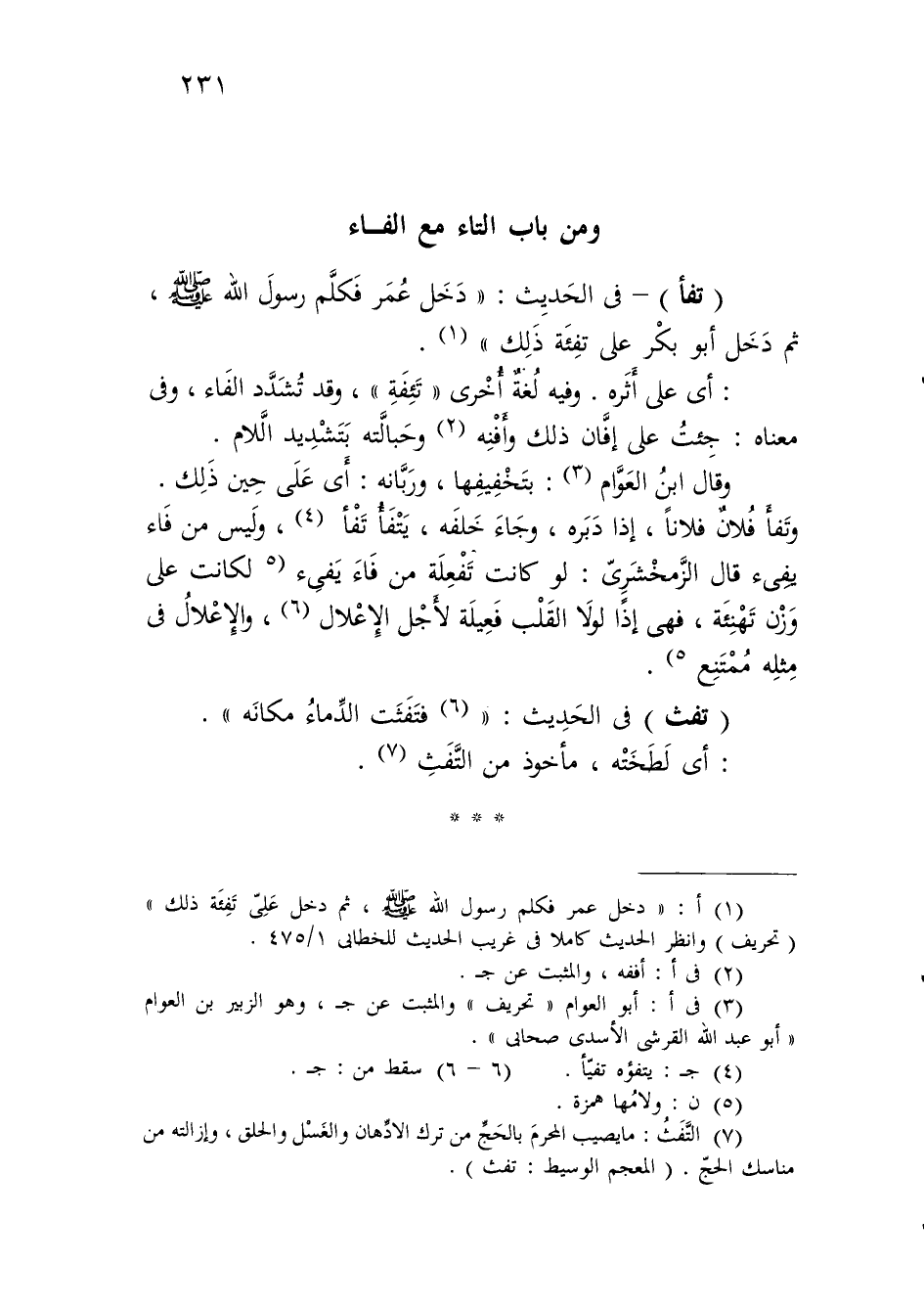 (¬1) أ: "دخل عمر فكلم رسول الله - صلى الله عليه وسلم -، ثم دخل عَلِىّ تَفِئَة ذلك" (تحريف) وانظر الحديث كاملا في غريب الحديث للخطابى 1/ 475.