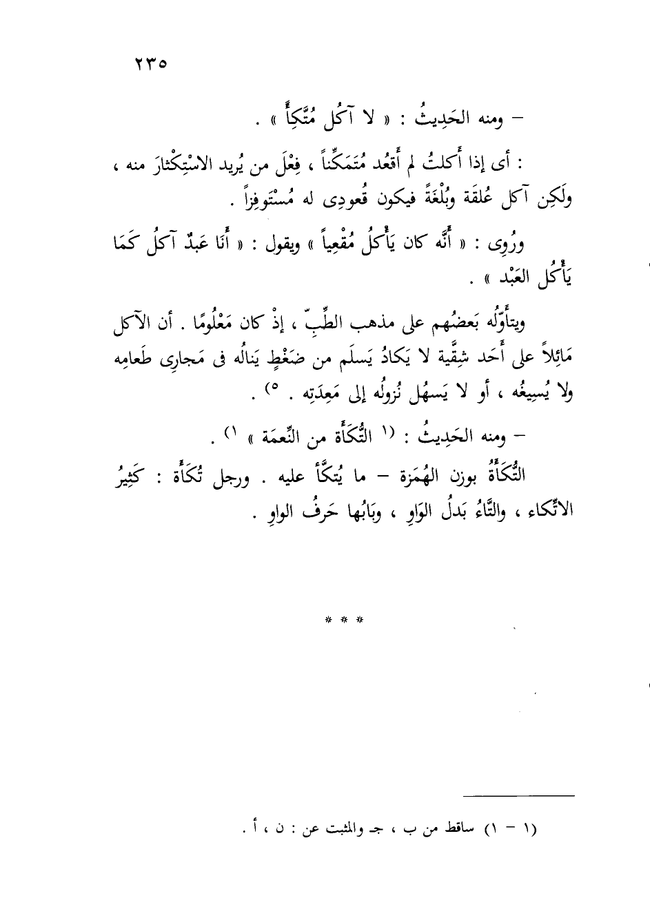 ويتأَوّلُه بَعضُهم على مذهب الطِّبِّ، إذْ كان مَعلُومًا. أن الآكل مَائِلاً على أَحَد شِقَّية لا يَكادُ يَسلَم من ضَغْطٍ يَنالُه في مَجارِى طَعامِه ولا يُسِيغُه، أو لا يَسهُل نُزولُه إلى مَعِدَتِه. 5).