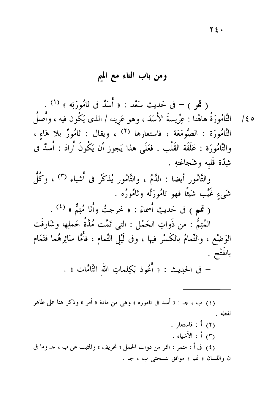 (¬4) في أ: متمر: التمر من ذوات الحمل "تحريف" والمثبت عن ب، جـ وما في ن واللسان "تمم" موافق لنسختى ب، جـ.