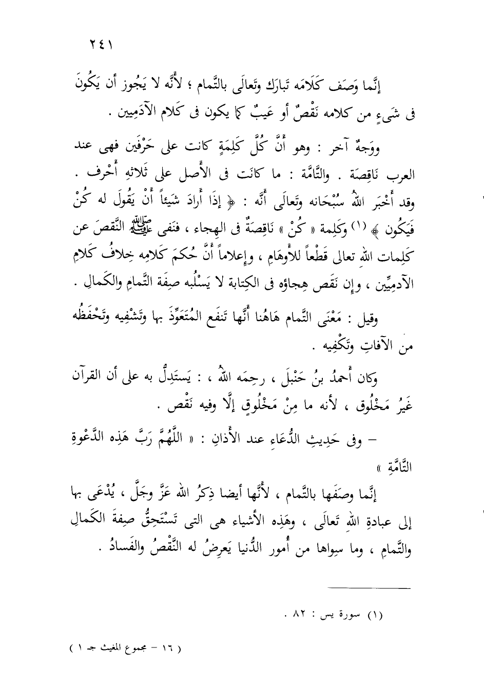 ووَجهٌ آخر: وهو أنَّ كُلَّ كَلِمَةٍ كانت على حَرْفَين فهى عند العرب نَاقِصَة. والتَّامَّة: ما كانَت في الأَصل على ثَلاثهِ أَحْرف. وقد أَخْبَر اللهُ سُبْحَانه وتَعالَى أَنَّه: {إِذَا أَرَادَ شَيْئًا أَنْ يَقُولَ لَهُ كُنْ فَيَكُونُ} (¬1) وكَلِمة "كُنْ" نَاقِصَةٌ في الهِجاء، فنَفى - صلى الله عليه وسلم - النَّقصَ عن كَلِمات اللهِ تعالى قَطْعاً للأَوهَامِ، وإِعلاماً أَنَّ حُكمَ كَلامِه خِلافُ كَلامِ الآدمِيِّين، وإِن نَقَص هِجاؤه في الكِتابة لا يَسْلُبه صِفَة التَّمامِ والكَمالِ.