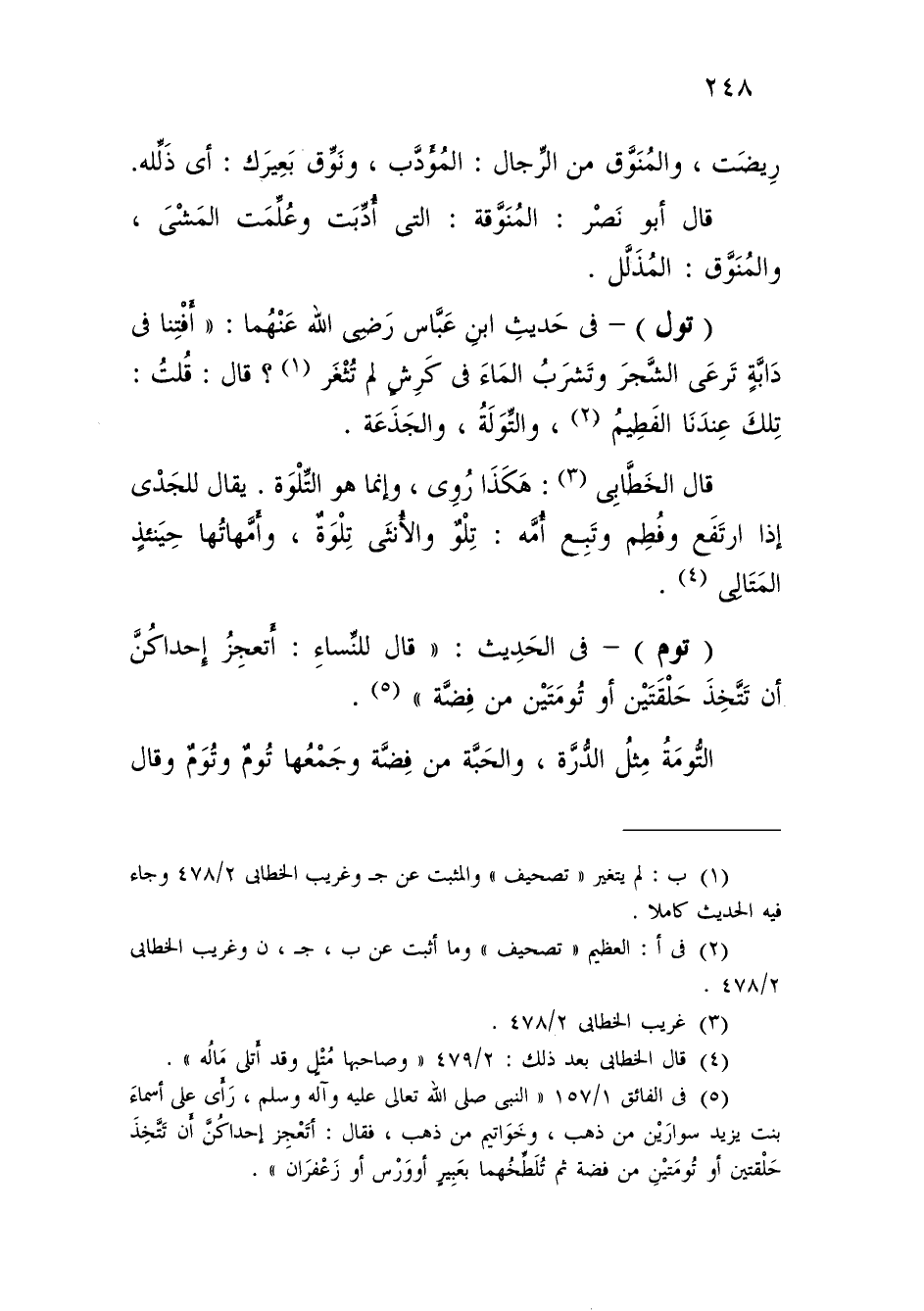 (¬5) في الفائق 1/ 157 "النبى صلى الله تعالى عليه وآله وسلم، رَأَى على أسماءَ بنت يزيد سوارَيْن من ذهب، وخَوَاتيم من ذهب، فقال: أتَعْجِز إحداكُنَّ أَن تَتَّخِذَ حَلْقتين أو تُومَتيْنِ من فضة ثم تُلَطِّخُهما بعَبِيرٍ أو وَرْس أو زَعْفرَان".