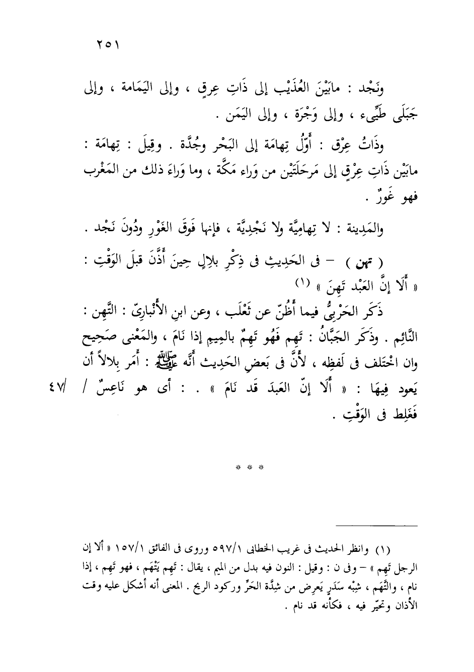 (¬1) وانظر الحديث في غريب الخطابي 1/ 597 وروى في الفائق 1/ 157 "ألا إن الرَّجل تَهِم" - وفي ن: ونيل: النون فيه بدل من الميم، يقال: تَهِم يَتْهَم، فهو تَهِم، إذا نام، والتَّهَم، شِبْه سَدَرٍ يَعرِض من شِدَّة الحَرِّ وركود الريح. المعنى أنَّه أشكل عليه وقت الأذان وتَحيّر فيه، فكأنه قد نام.