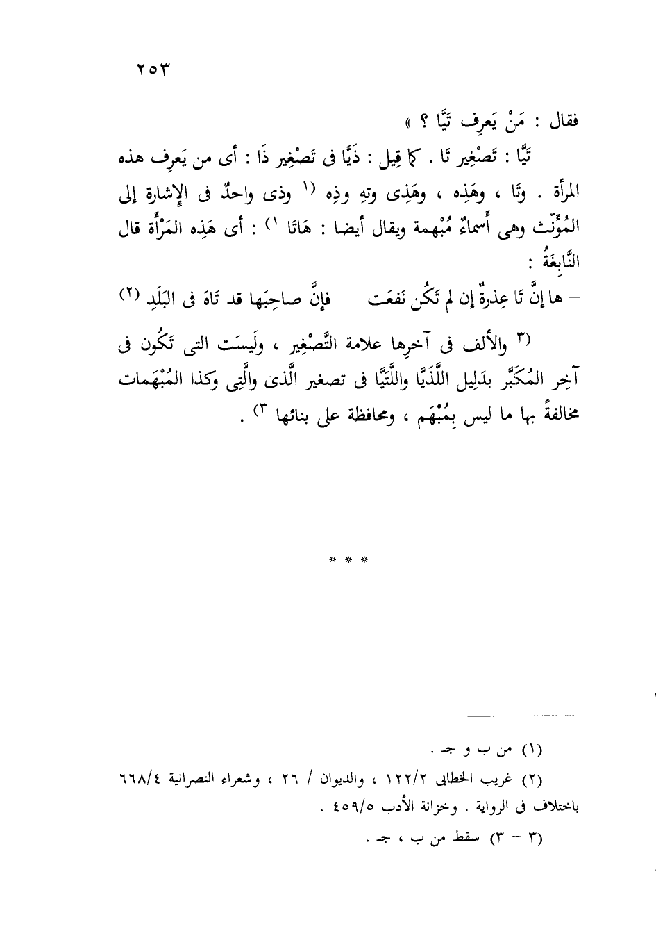 (3 والألف في آخرها علامة التَّصْغِير، ولَيسَت التي تَكُون في آخِر المُكَبَّر بدَلِيل اللَّذَيَّا واللَّتَيَّا في تصغير الَّذى والَّتِي وكذا المُبْهَمات مخالفةً بها ما ليس بِمُبْهَم، ومحافظة على بنائها 3).